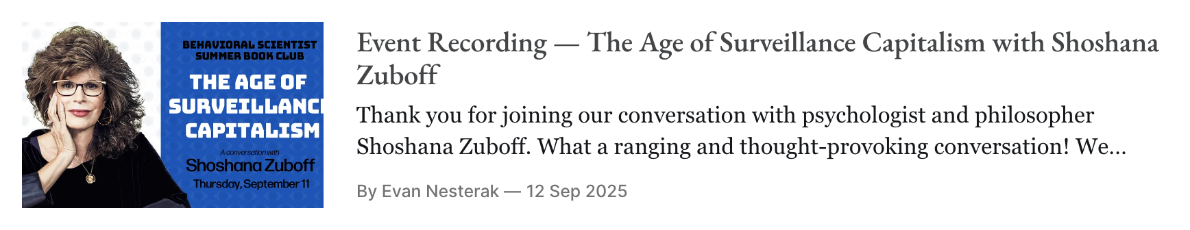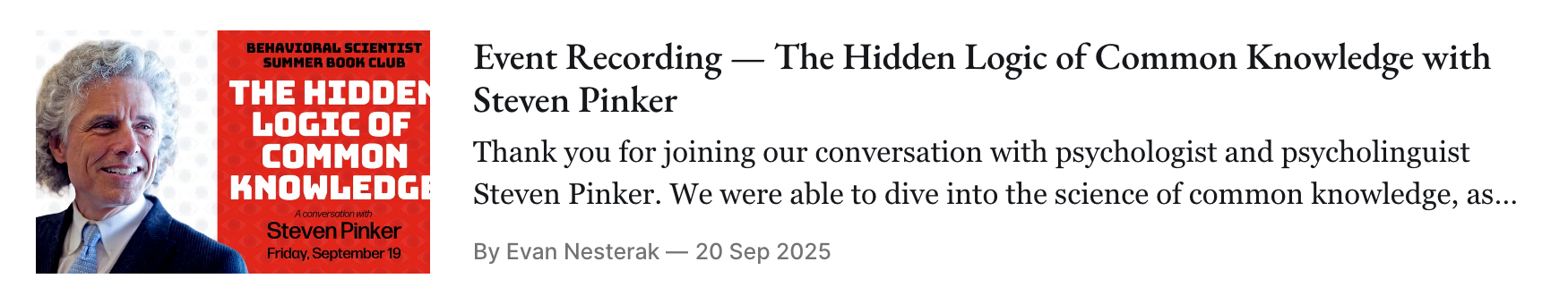 And in case you missed it! Check out our other two expert conversations from this summer, with Shoshana Zuboff on surveillance and Steven Pinker on "common knowledge."