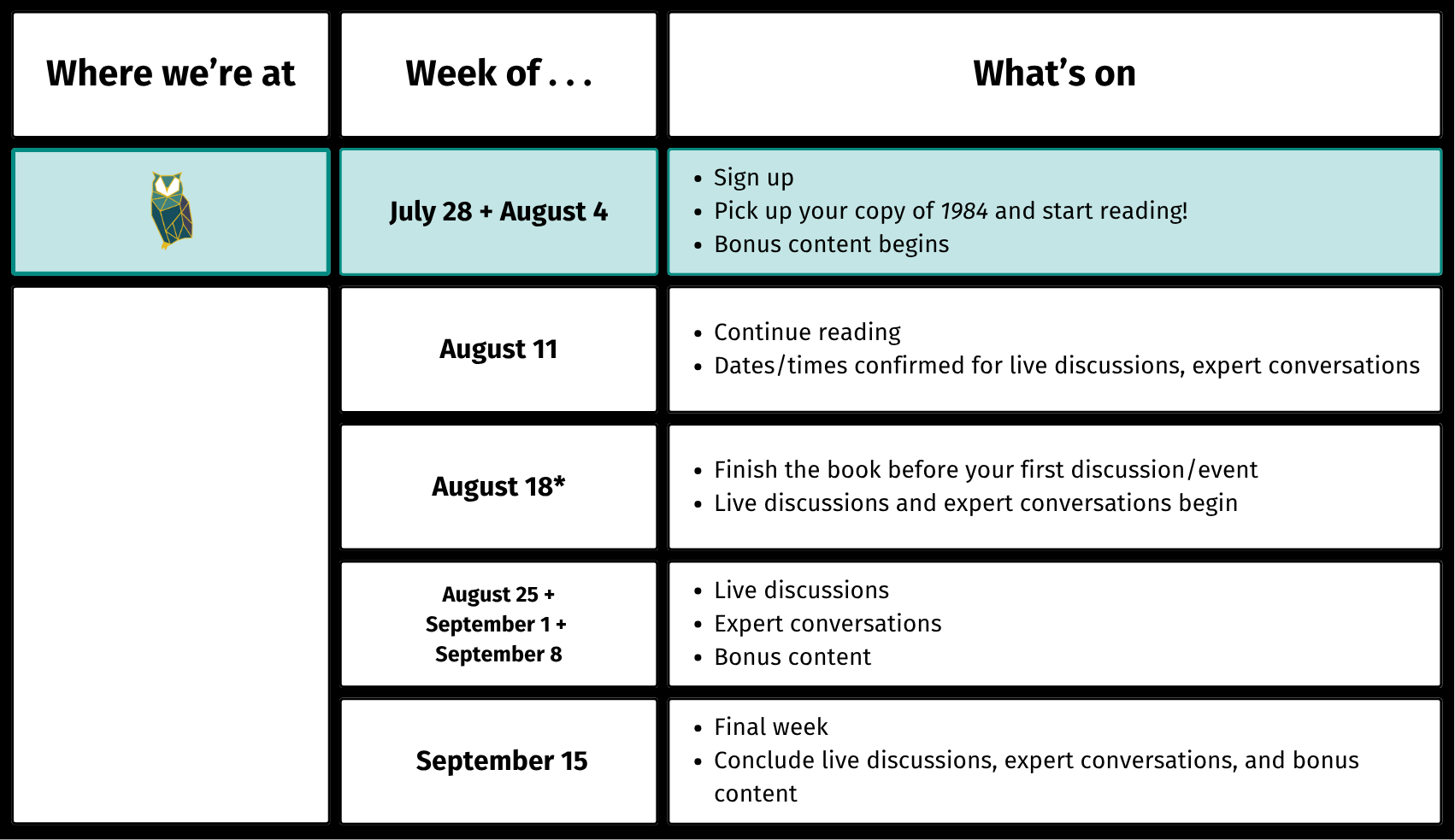 Ghosts from the Future will begin in late-July and run through mid-September. The first week is for signing up for the book club and picking up your copy of 1984. The first three weeks are slated for reading 1984, supplemented by bonus articles and content. During the week of August 18, we’ll aim to confirm the schedule for live group discussions and expert conversations. If you’re looking for a target date by which to complete the book, then aim to turn the last page before the first group discussion/expert conversation once it's scheduled (around the week of August 25). The book club will conclude the week of September 15.