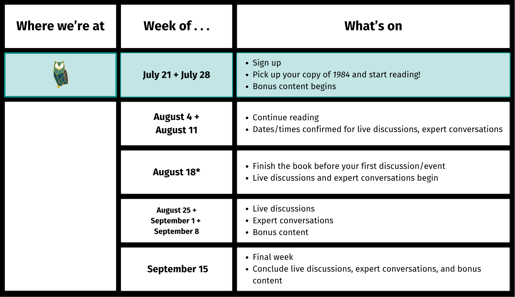 Expert conversations: There are so many great themes to explore from the book. Soon we’ll be announcing the lineup of behavioral scientists, historians, authors and others who we’ll bring in to help illuminate questions and ideas inspired by 1984. To help it fit within members’ schedules, we’ll feature both conversations you can attend live and recorded conversations you can listen to asynchronously.
